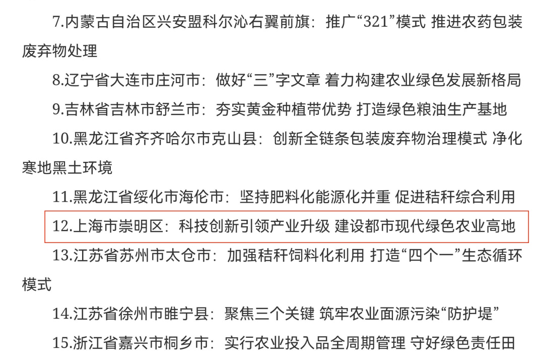 2017年,崇明入选全国首批、上海首个农业绿色发展先行示范区,2018—2020年连续三年入选《中国农业绿色发展报告》十大农业绿色发展典型案例,2019—2020年连续两年农业绿色发展指数位列全国第一,农业绿色发展处于全国领先水平。