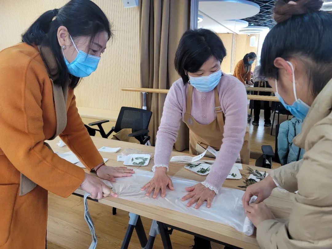 现场,每个人拿起手中浸泡过的植物叶子,以各种形态摆放在展开的丝巾上。然后,经过学员的合作,小心翼翼的将丝巾与叶子紧紧的捆绑在一起,最后,通过现场高温蒸煮、漂洗晒干等步骤,每个学员手上得到一款独一无二的花式艺术丝巾。