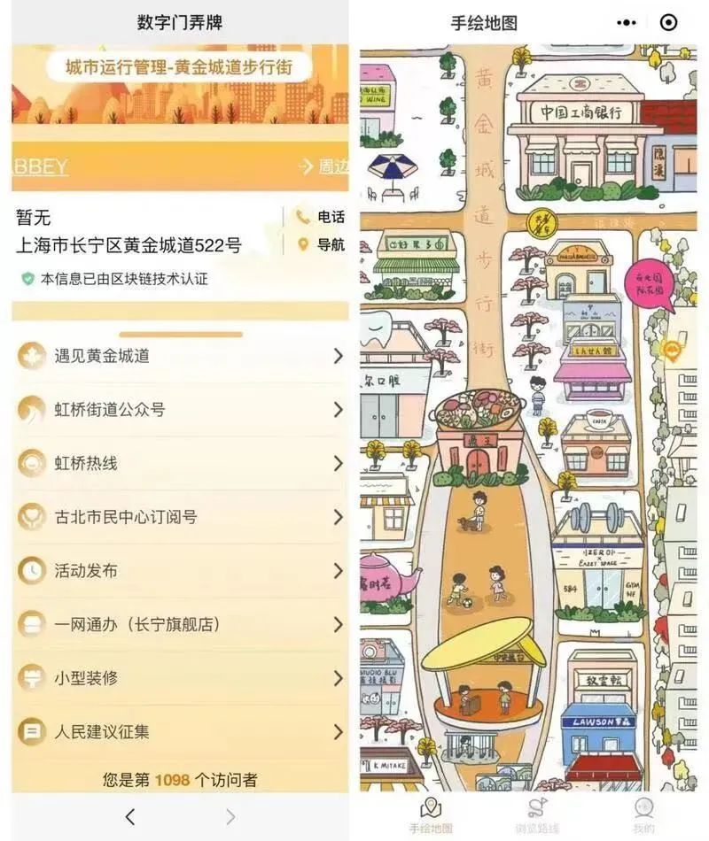 在数字化转型的大背景下,黄金城道步行街的商户及公共设施陆续安装数字门弄牌,将地址和其他属性的信息生成规范的“身份证”,涵盖了200个商户50个公共部件。此外,遇见·黄金城道小程序也在步行街共治委员会的支持下开发上线,在此基础上拓展了各类新应用,为社区居民提供更智慧更丰富的生活服务。