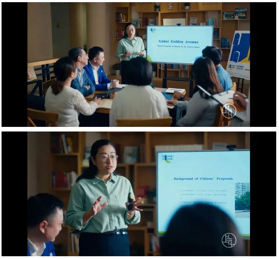 影片用客观扎实的史料、生动有力的故事、充满张力的人物,展现上海海纳百川、追求卓越、开明睿智、大气谦和的城市精神和开放、创新、包容的城市品格。其中在1分30秒处出现的「knock knock黄金城道步行街街区提案计划」会议场景,就发生在虹桥街道的古北社区。