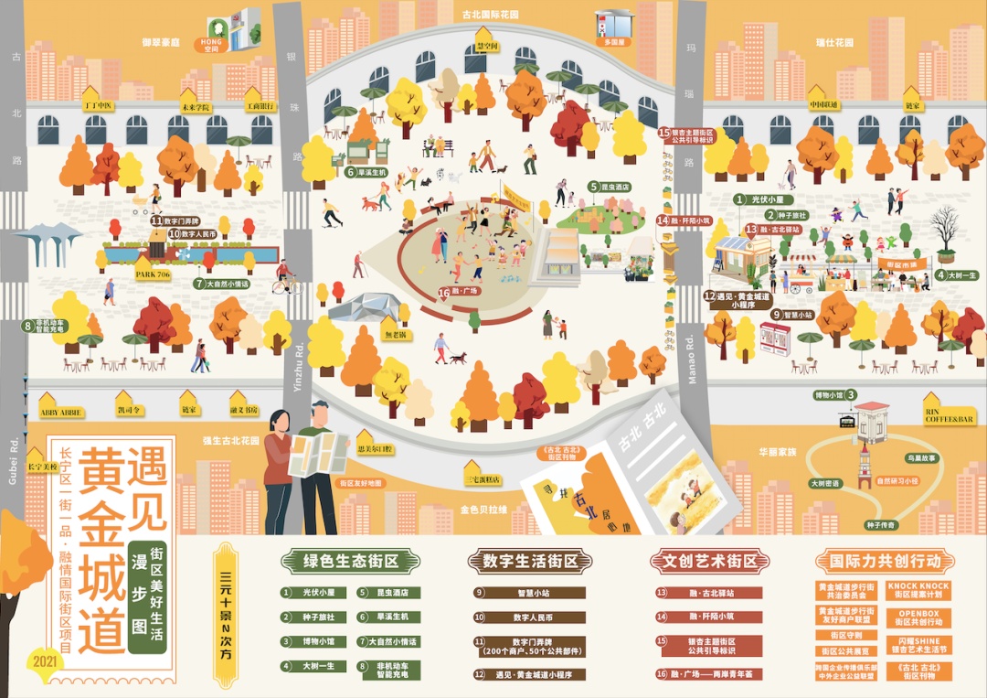 如今,黄金城道步行街焕发新光彩,沿线6个业委会和214家商户围绕绿色生态、数字生活、文创艺术三大主题,完成了光伏小区、昆虫酒店、数字门弄牌、融·阡陌小筑等16项微更新改造,并辐射出《古北 古北》街区刊物、街区公共展览等行动,形成 了“三元十景N次方”的街区美好生活。