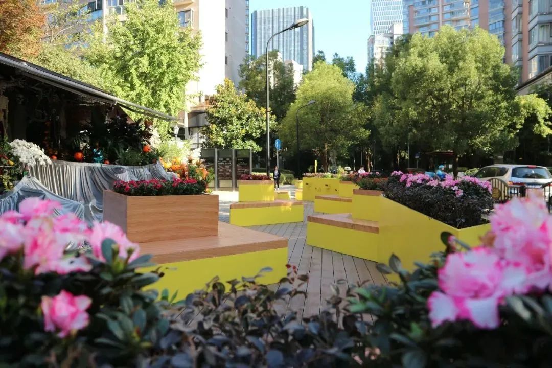 位于黄金城道、玛瑙路路口的融·阡陌小筑,名字源于《桃花源记》里的“阡陌交通”一词。这个由黄色多边形装置围合而成的公共空间,一旁还附带了专供非机动车停放的港湾式停车点,为街区营造了安全、有序的公共空间。