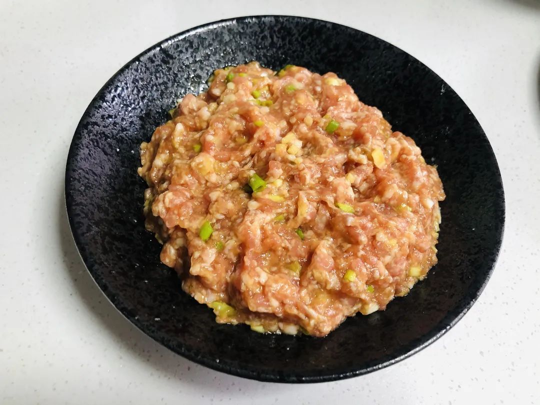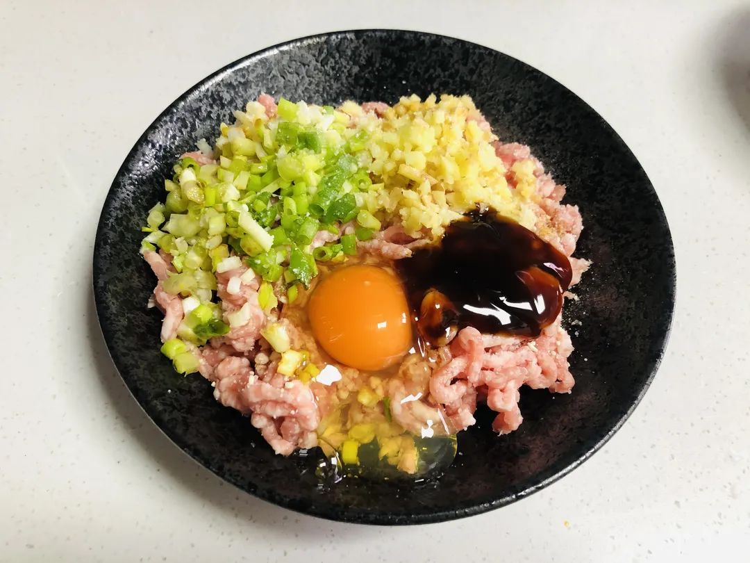 2.肉末里加姜末、葱花、鸡蛋、蚝油、料酒、生抽、食盐,拌匀后腌制10分钟;