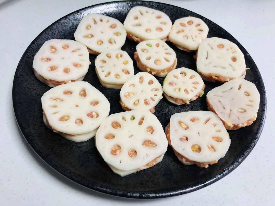 3.将肉末夹在两片藕片中间,压平夹紧,做出藕合;