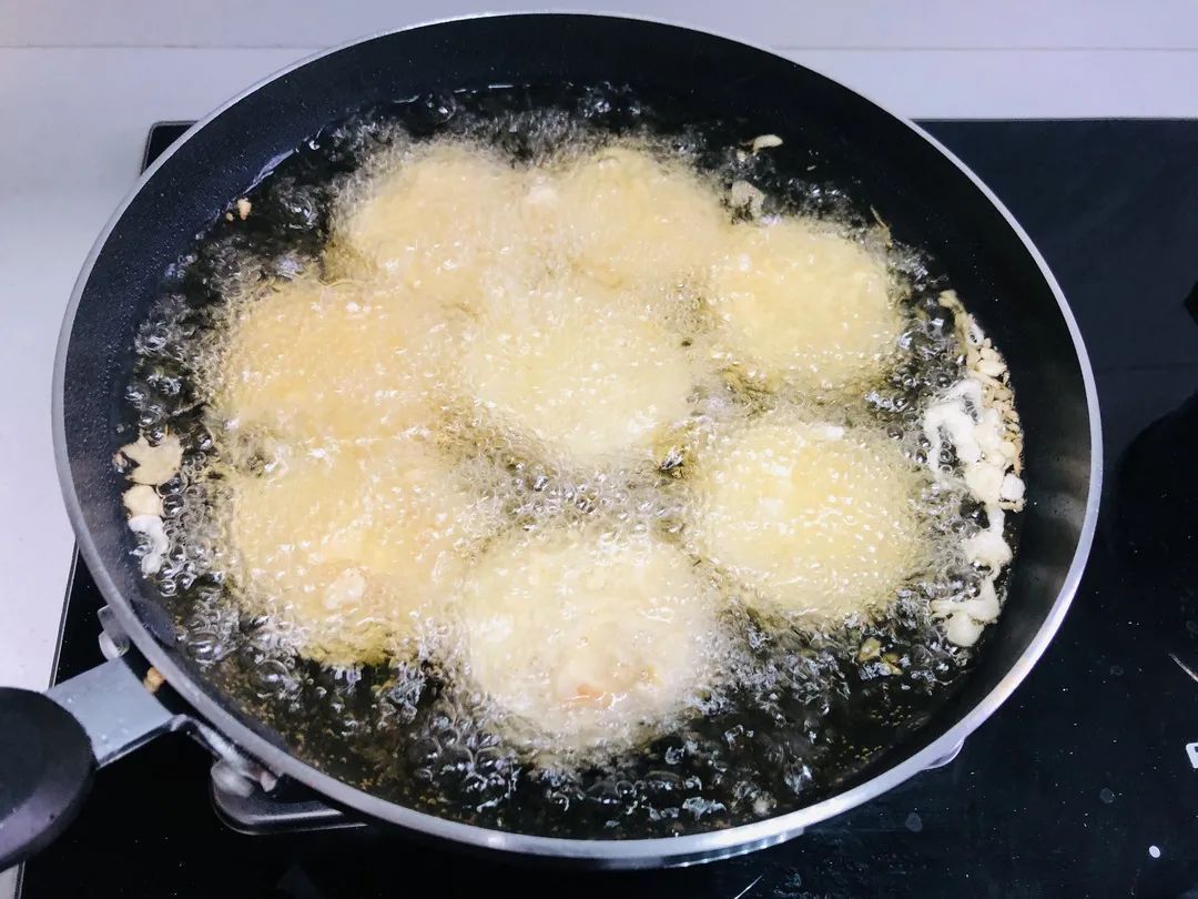 5.油锅七成热后放入裹好面糊的藕合炸制,且不时地给藕合翻面;