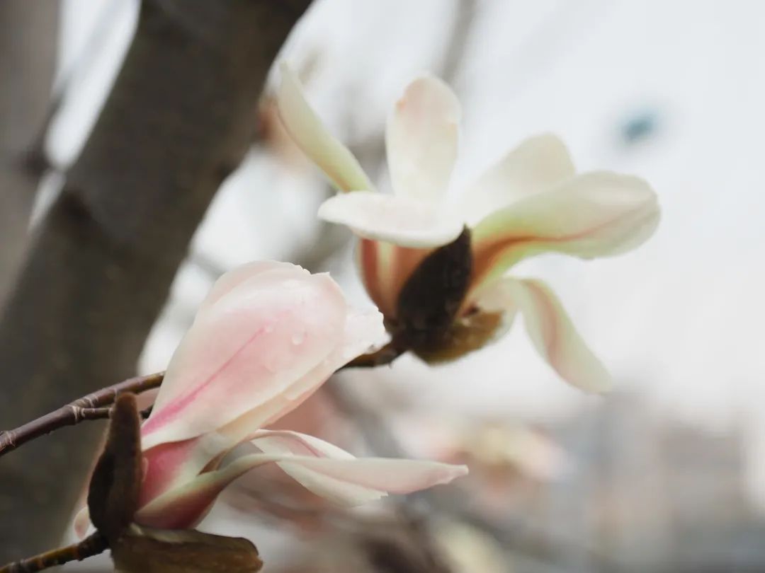 二乔玉兰有深紫色和白紫相间两种花色。早春开花的玉兰有六瓣花瓣,紫色从花萼处晕出,延伸至花瓣顶端,渐渐转为粉色。花朵或舒展盛放,或才吐芬芳,不少花瓣上还沾着清晨的细雨,在阳光的照耀下晶莹剔透,美不胜收。“这就是活脱脱的春姑娘呀。”市民忍不住点赞。