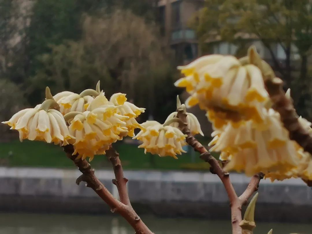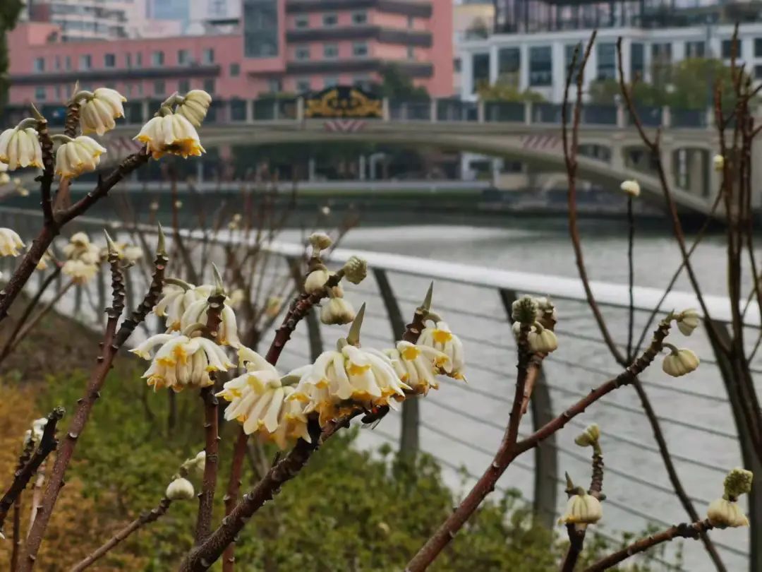 其实,城市中有不少花卉会“报春”。苏州河岸线滨河步道宝成湾附近,两岸的结香花花开正盛,花香四溢。结香花与玉兰花花期相近,有“报春仙子”的美称。一团团嫩黄色的花球簇拥着,在阳光下闪着耀眼夺目。春风微拂,甜美的花香沁人心脾,吸引着蜜蜂穿梭花间。“在步道上散步时而有香味飘来,很舒服。”尽管市民不熟悉结香花,但是他说,花开了,春天也就到了。