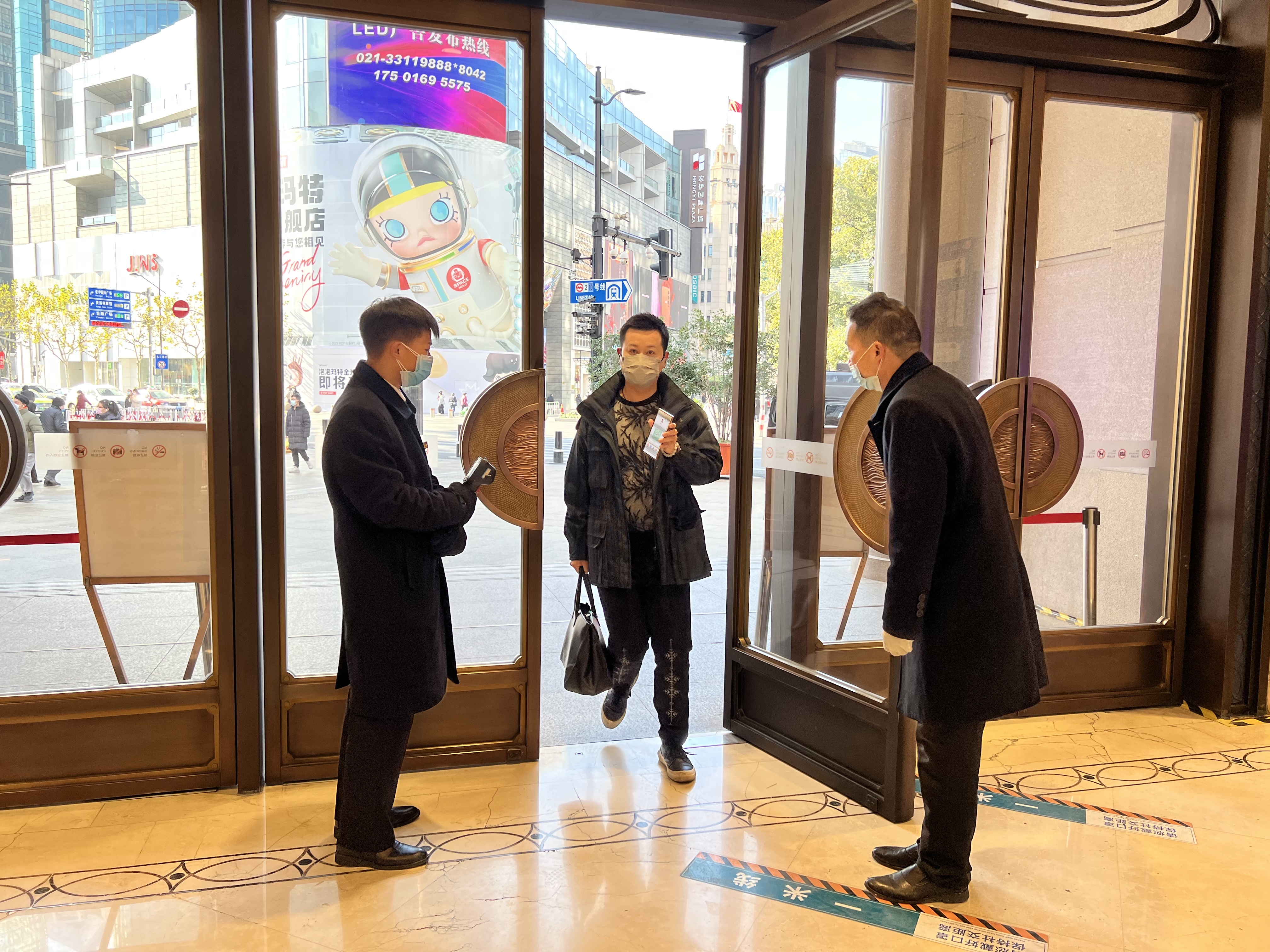 “请出示您的健康码,配合测量体温,进入商场后请佩戴口罩。”今天中午,在南京路新世界大丸百货停车场入口处,安保人员正在认真地对每一辆驶入车辆进行查验。