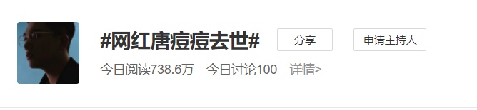 唐痘痘去世的消息最初来源于他的好友发文“忽然接到这个噩耗,我接受不了……”随后,唐痘痘的另外一位好友也证实了这个说法,称唐痘痘因急性胰腺炎去世。
