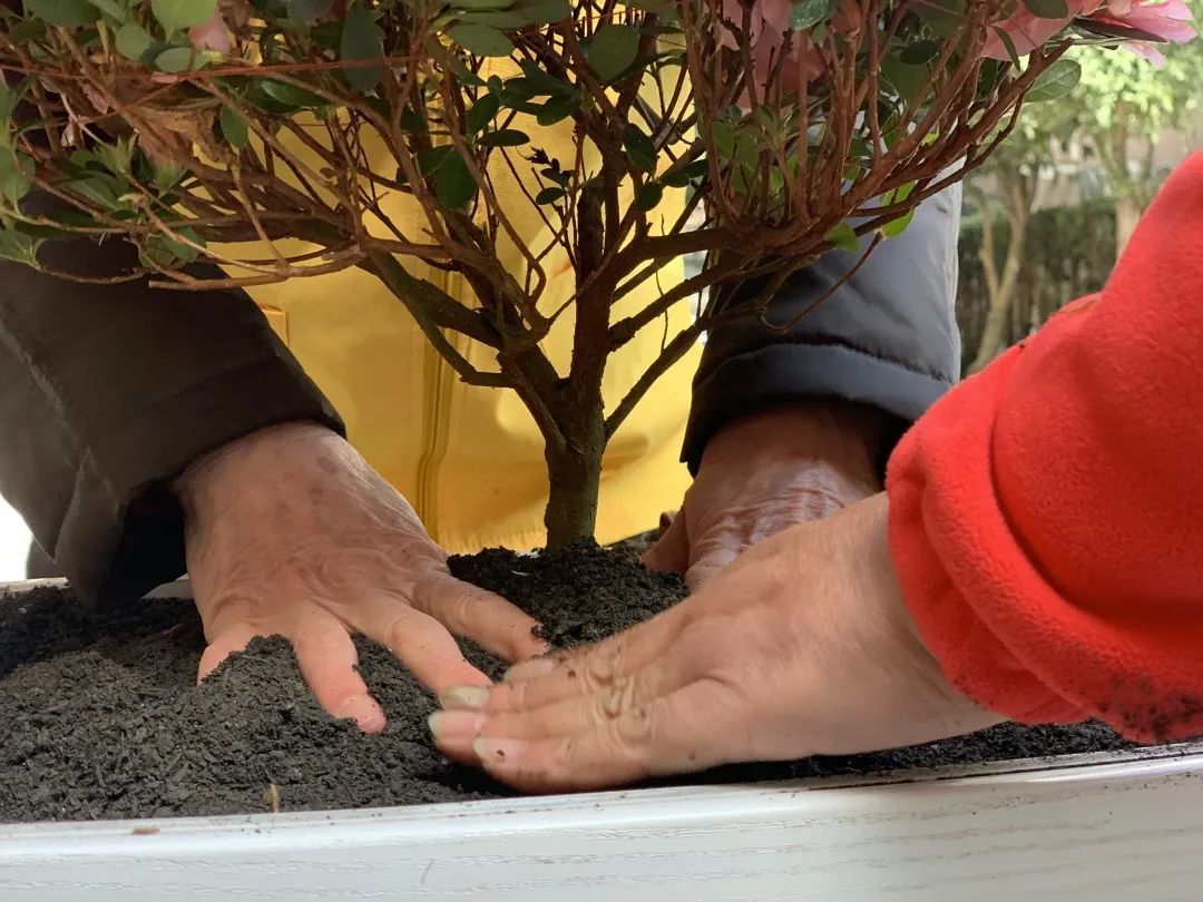 挖开泥土、放入植物、埋土、浇水……上午九点,在浣纱四村的中心花园里,参加活动的阿姨们正在移植新鲜的杜鹃花。