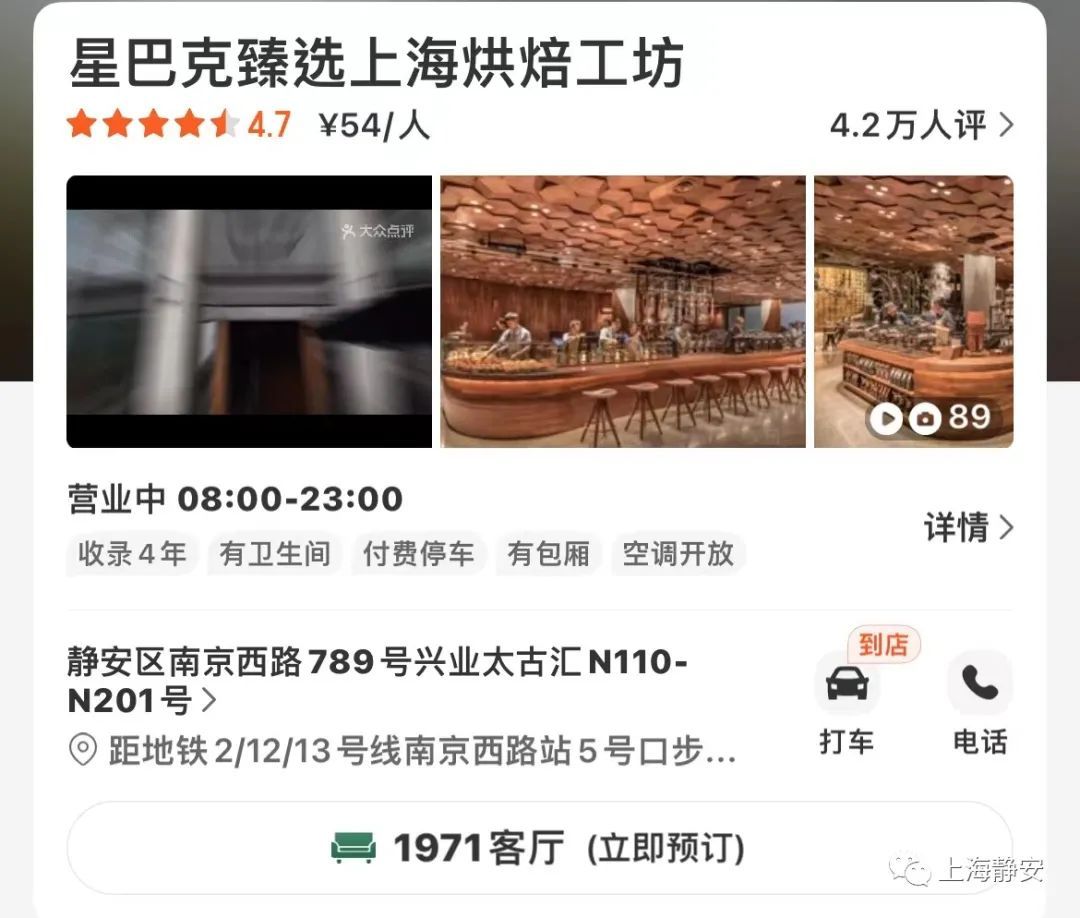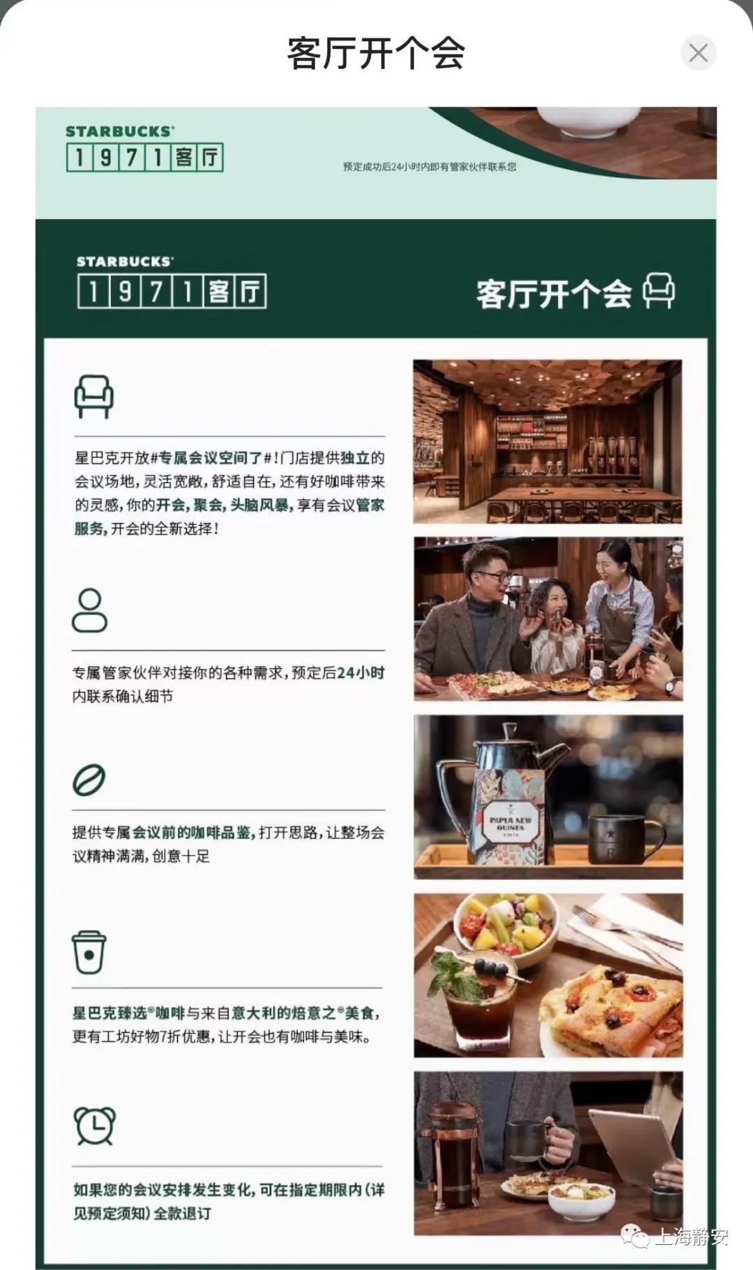 消费者可以在美团或大众点评App上搜索“星巴克”或“1971客厅”,找到本地可订的门店,点进门店首页,进入“1971客厅”的预定页面,预订星巴克门店中的专属空间。