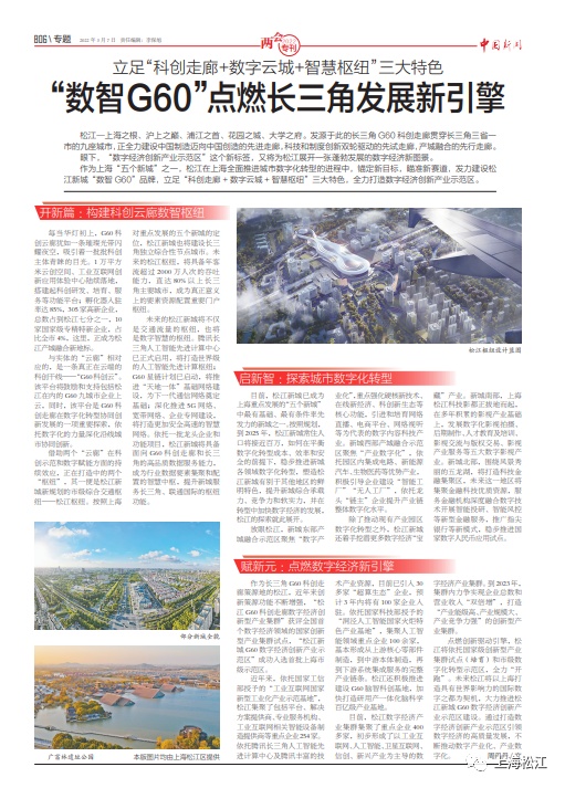 昨天(3月7日),中国新闻报以《立足“科创走廊+数字云城+智慧枢纽”三大特色 “数智G60”点燃长三角发展新引擎》为题,专版报道了松江锚定新目标,全力打造数字经济创新产业示范区的做法,一起来看全文↓