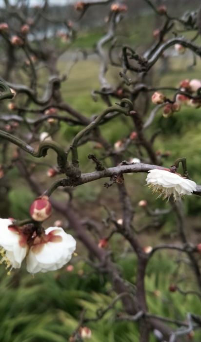 其枝条曲散自然,不定型,宛若游龙,花白色,重瓣,花瓣18-20,花期1月底到2月中旬。