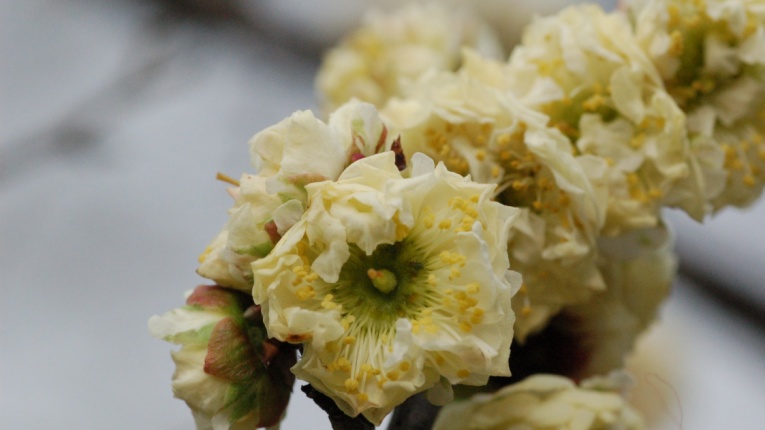 单瓣重瓣都有,花型碟型,花色淡黄色,萼片绛紫色。单瓣黄香、南京复黄香、黄金鹤。花期2月中到3月中旬。