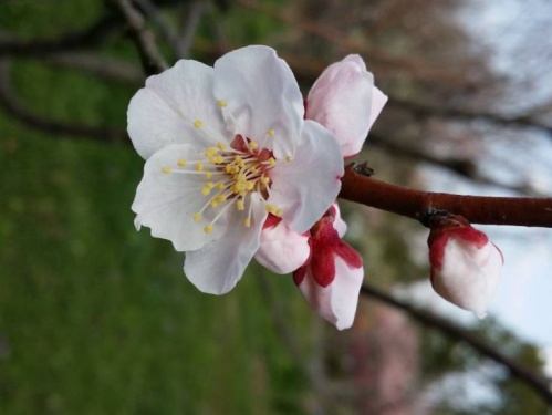 单瓣重瓣都有,花瓣5-30不等,花色常在花瓣上洒水红色斑,或少数枝条上全红色,其它枝条上白色,个别一朵花朵半红半白。花期2月下到3月下旬。