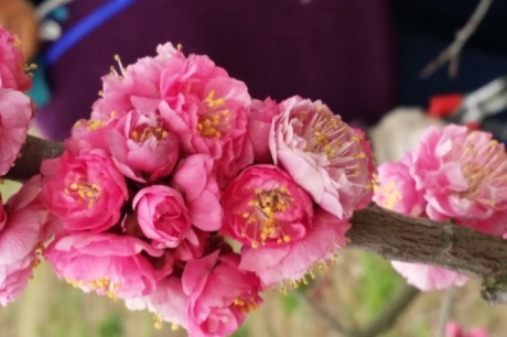 枝干木质部为红色,大部分重瓣、个别单瓣,花瓣5-37不等,花色粉色到深紫色,浓香;萼片绛紫色。花期2月中旬到3月下旬。