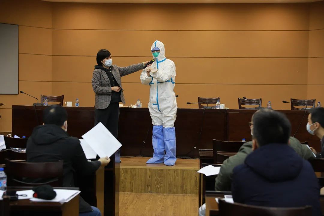 13:00,火速集结的青年志愿者正在进行防护服穿脱等培训。他们是来自莘庄镇各机关单位的基层工作人员,在接到防疫任务后,立刻交接好手头的工作、收拾好行李前来,有人甚至忘了吃午饭。
