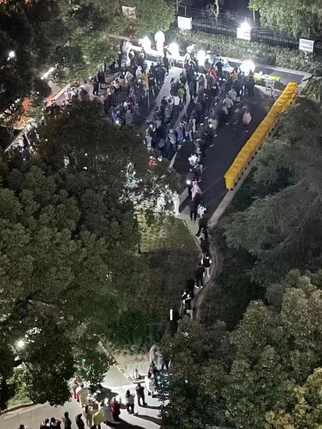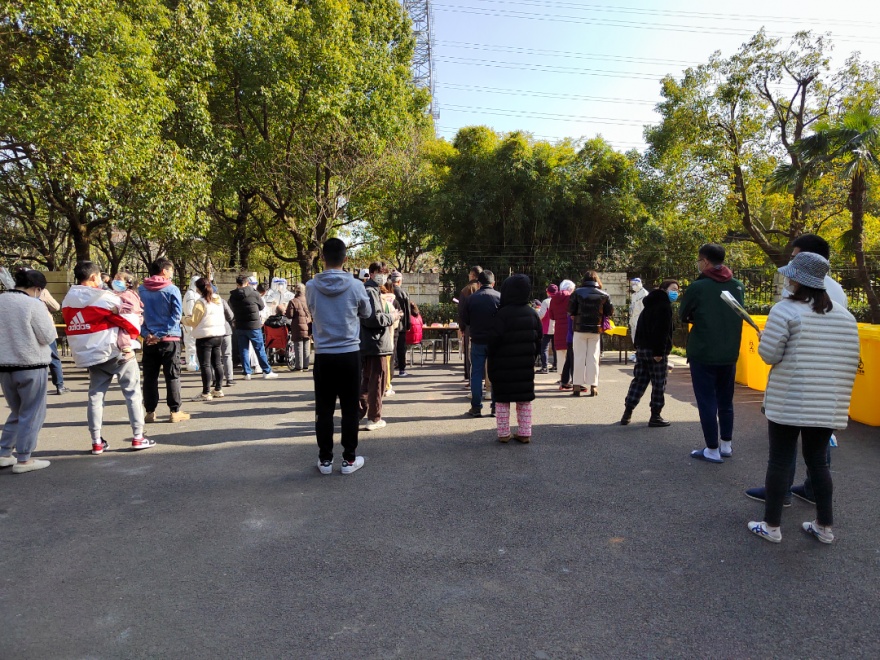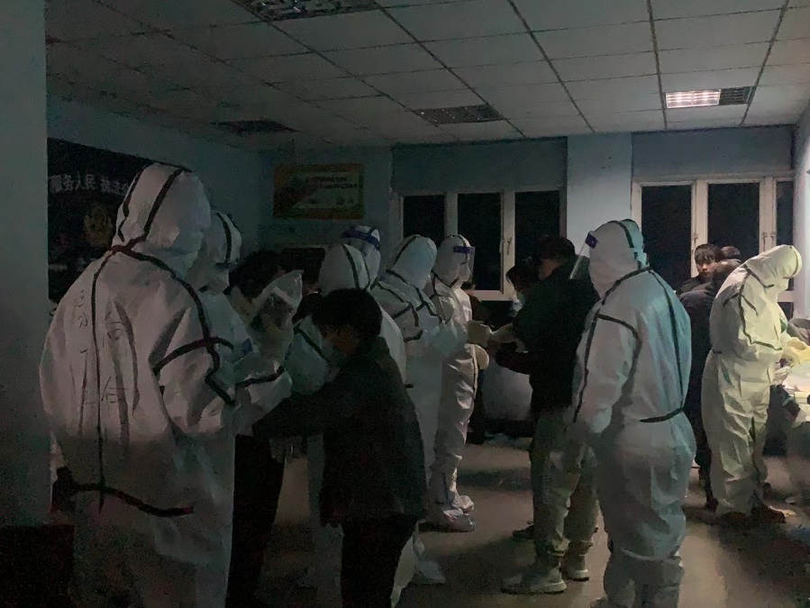 21:00,进驻的医护人员开始对居民开展核酸采样工作,小区居民按照楼栋分组,由志愿者带队,依次下楼有序进行,首日采样工作持续到夜里11点多结束。