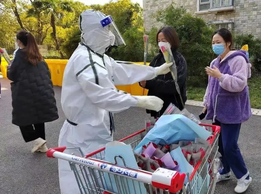 昨天是“三八”国际劳动妇女节,在小区核酸检测现场,女性同胞们还收到了莘庄镇送来的鲜花。“每一位居民都是抗疫战士”,鲜花寄托温情与敬意,向大家致以美好的祝福。