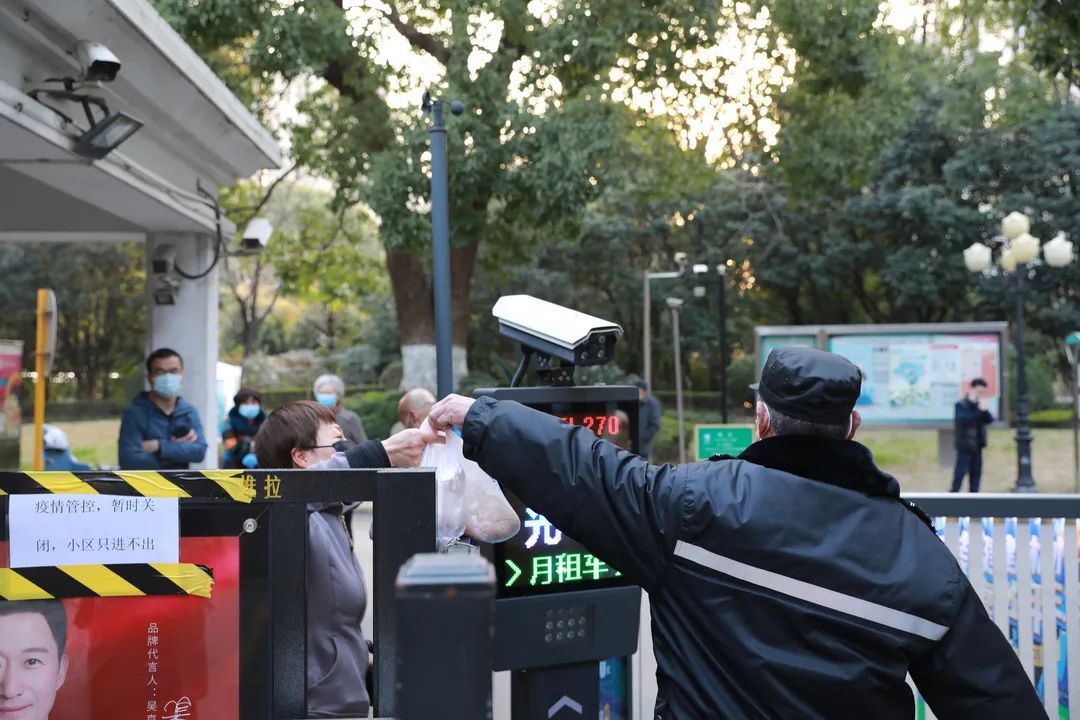 17:00,“疫情管控,暂时关闭,小区只进不出”,小区门口,安保人员正在帮居民取家人送来的物品,还不停地与归来的居民解释目前小区的情况。