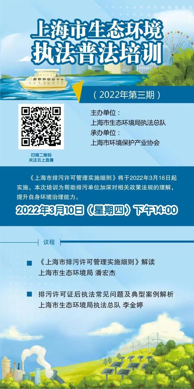 《排污许可管理条例》于2021年3月1日起施行,推动建立“企业自证守法、政府依证监管、社会共同监督”的新型环境治理体系;《上海市排污许可管理实施细则》即将于今年3月16日起实施,为规范本市排污许可管理、强化固定污染源监管、严格控制污染物排放、促进生态环境质量改善提供了有力支撑。市环境执法总队将组织第三期生态环境执法普法培训,旨在帮助排污单位加深对排污许可相关政策法规的理解,同时提升环境执法人员业务水平。