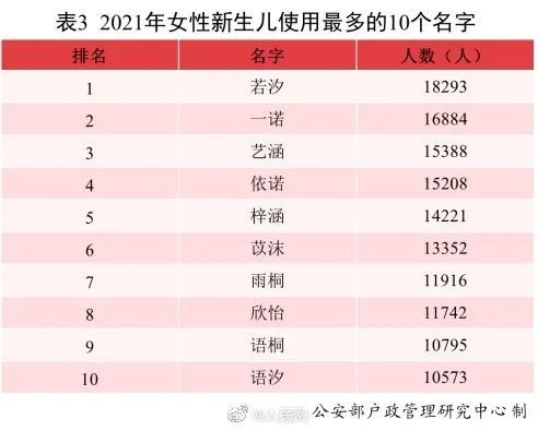 与2020年相比,若汐、艺涵、苡沫首次进入前十,其中“若汐”使用人数达到1.8万,登顶榜首,成为女性新生儿名字首选。