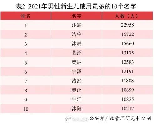 与2020年相比,除浩宇、奕辰、宇轩外,其余名字首次进入前十,其中“沐宸”使用人数达到2.3万,登顶榜首,成为男性新生儿名字首选。
