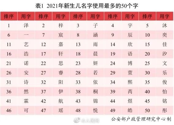 2021年出生并已经进行户籍登记的新生儿名字中,使用频率最高的50个字依次为泽、梓、子、宇、沐等。与2020年相比,汐、芮、霖、航等字受到青睐。