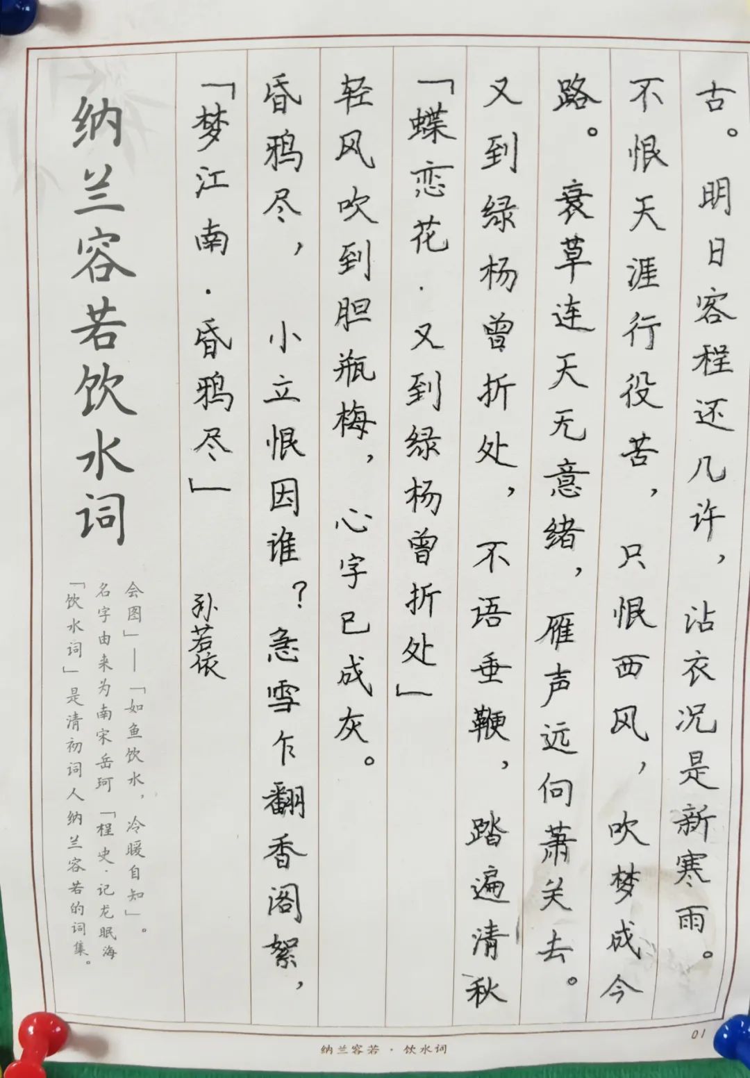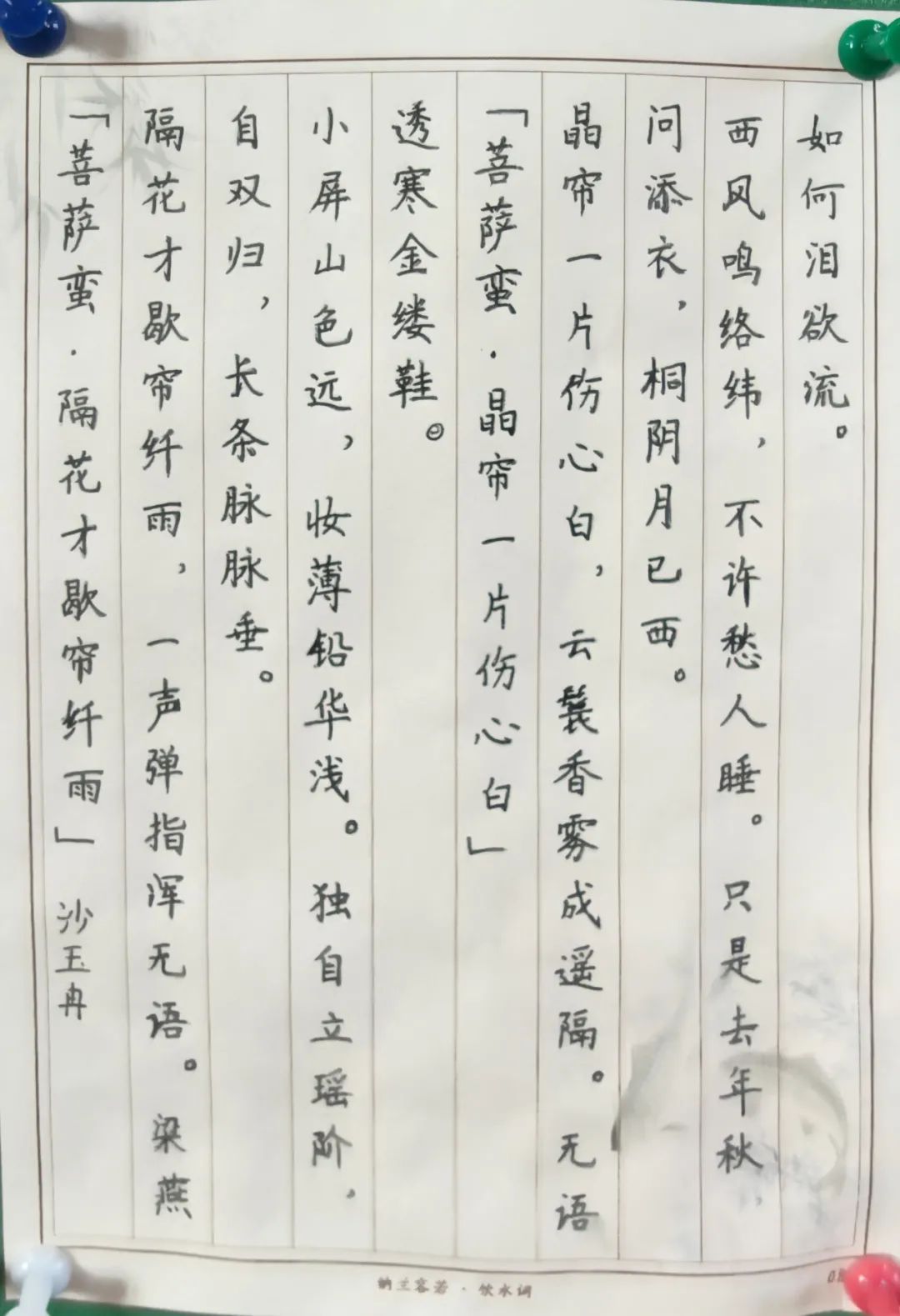 诵《饮水词》润泽心灵。语文教师带领孩子们读纳兰性德诗词,临摹书法作品,感受诗词的丽浪漫。