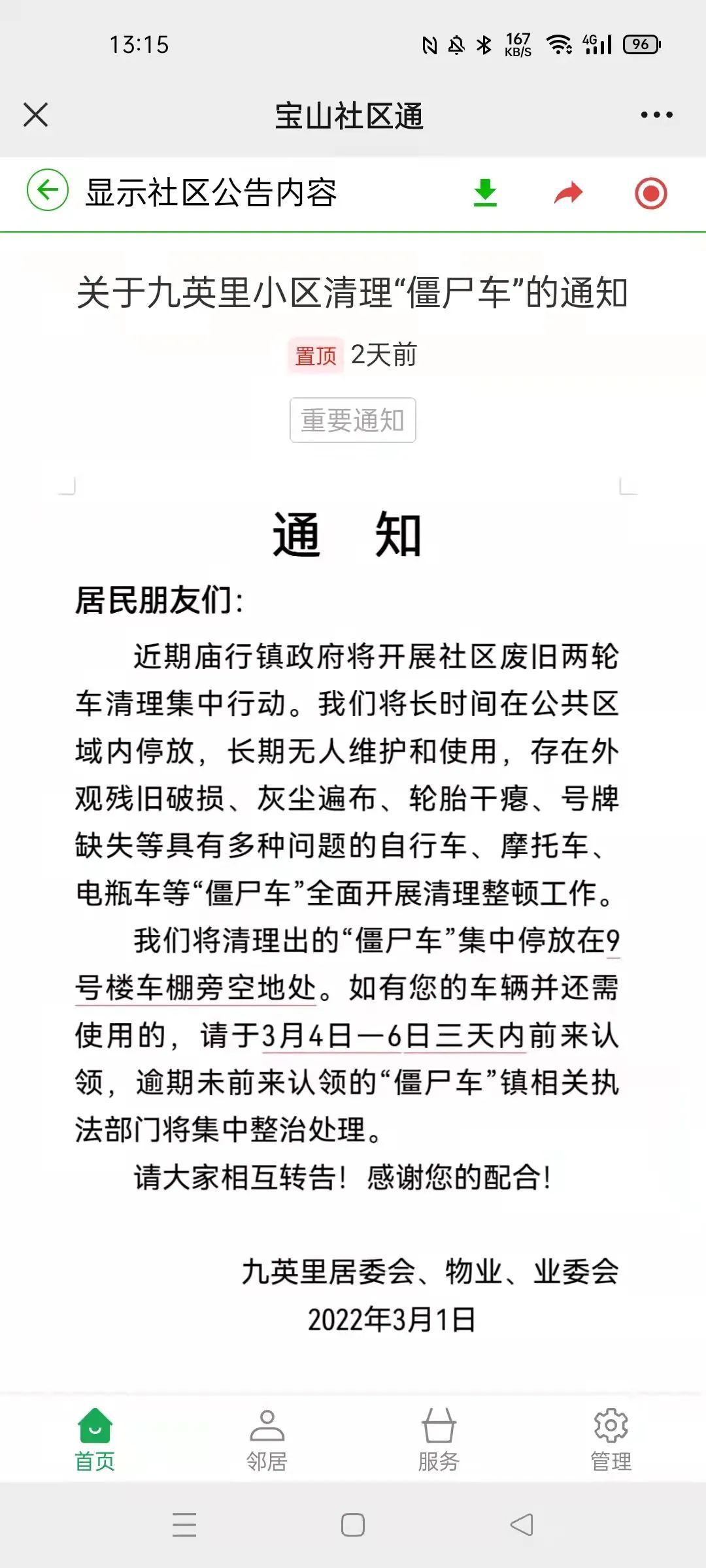 通过社区通、电子屏、业主微信群、宣传栏、张贴通告、楼组长上门告知等多种形式,发布开展清理“僵尸车”通知,让整治行动家喻户晓,给居民预留自行清理的时间。