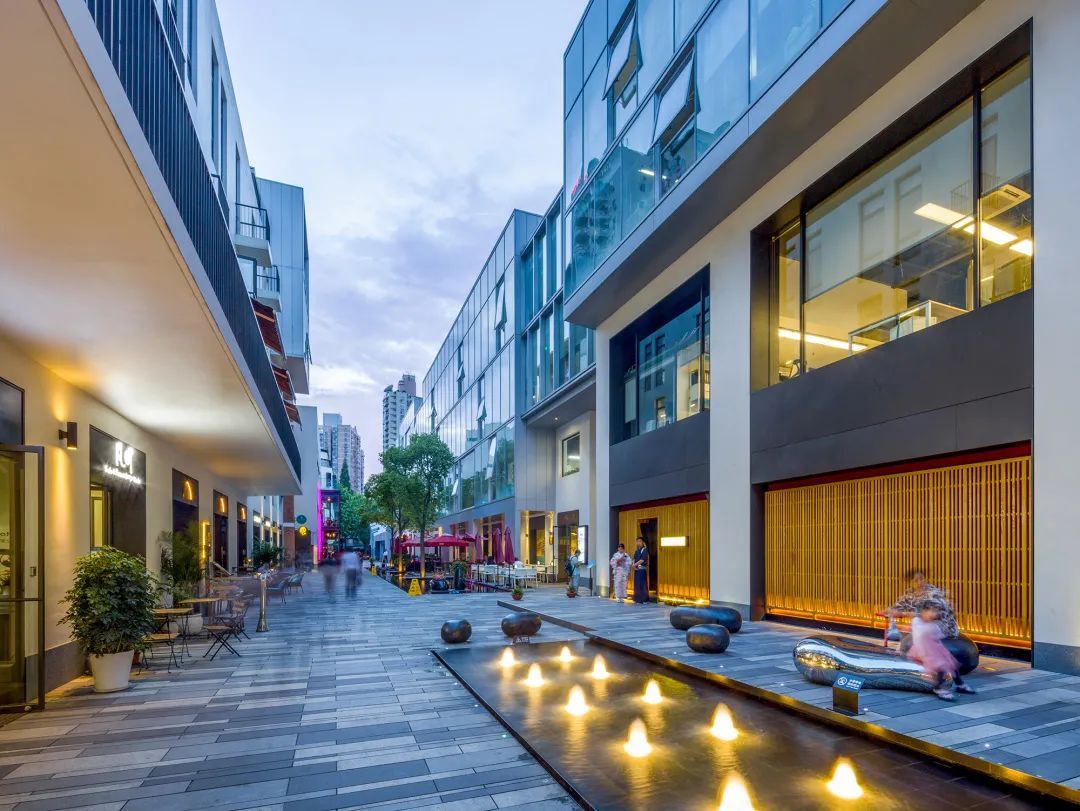 园区通过拆除围墙和大门,将幸福路和番禺路连通,不仅为周边居民打通了一条开放的步行道,而且两侧分布了43家不同类型商铺,包括了品牌咖啡馆、酒吧、蛋糕店、健身房,搭配棱角分明的冷色建筑装饰,整个街区显得新潮且活力十足。