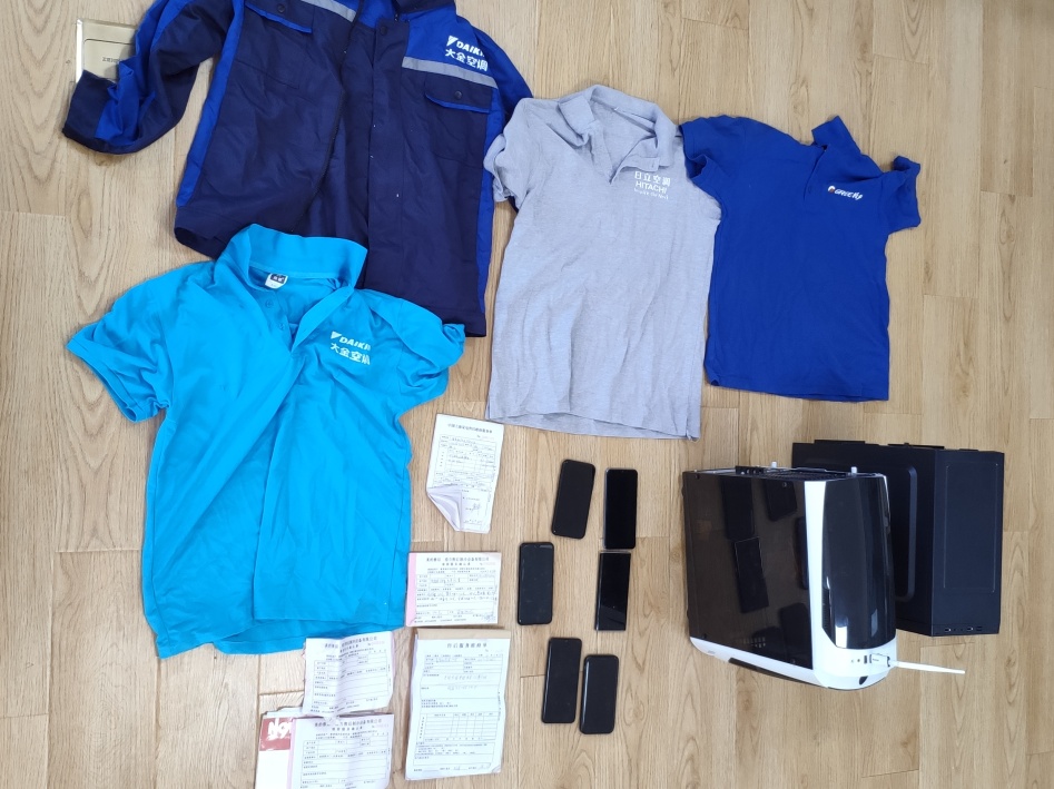 在大量走访、收集证据的基础上,专案组逐渐锁定了几名维修工的身份和活动规律。2021年9月,奉贤警方先后在本市普陀曹杨、闵行梅陇及青浦明珠路等地抓获犯罪嫌疑人王某、吴某、黄某、朱某4人。11月,又分别在闵行浦江、浦东周浦抓获犯罪嫌疑人邵某、李某2人。在上述维修工居住地及交通工具内,警方查获了带有多个知名品牌空调标识的工作服、假冒售后服务工作证件及大量空调维修保养零件、工具、单据及耗材。