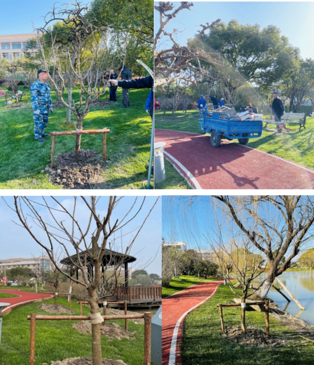 上海海关学院的绿化师傅们在美丽的青莲湖畔进行樱花树种植活动。师傅们用铁锹挖坑,挖好后将树苗放进土坑,再将土回填、浇水、打木桩,共种植樱花树八十多棵。种好的樱花树挺立在步道两侧,等到春暖花开的时候,它们都会盛开在青莲湖畔,让人们感受春天的美好。
