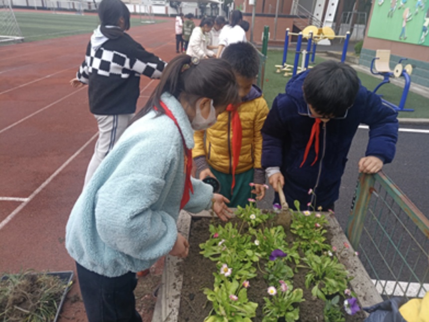 松江区第三实验小学于上学期修建了“葵园农场”,系统开展农作物和花卉种植,今年植树节前夕,同学们又栽下了五棵树苗,在这春意盎然的时节里开展护绿行动。