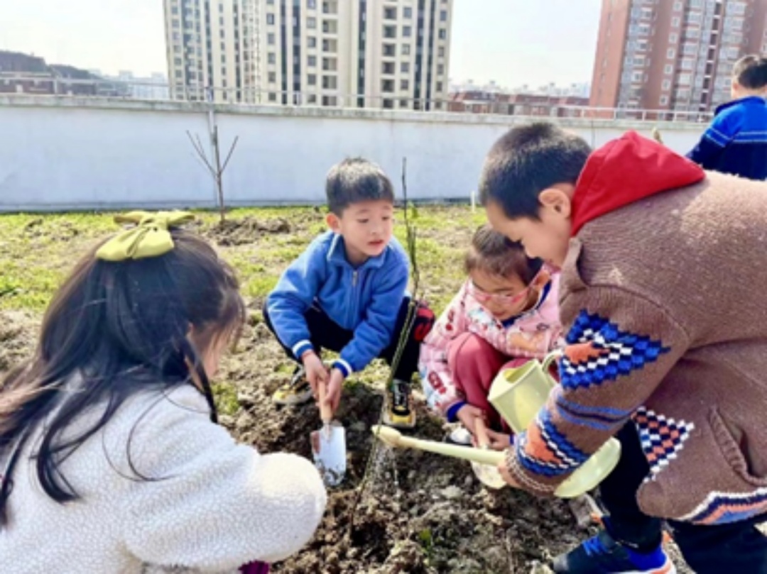 青秀城幼儿园的孩子们在屋顶花园中分工合作,带着期望一起种下小小的树苗,盼望未来为更多的小伙伴们带来一片绿意。