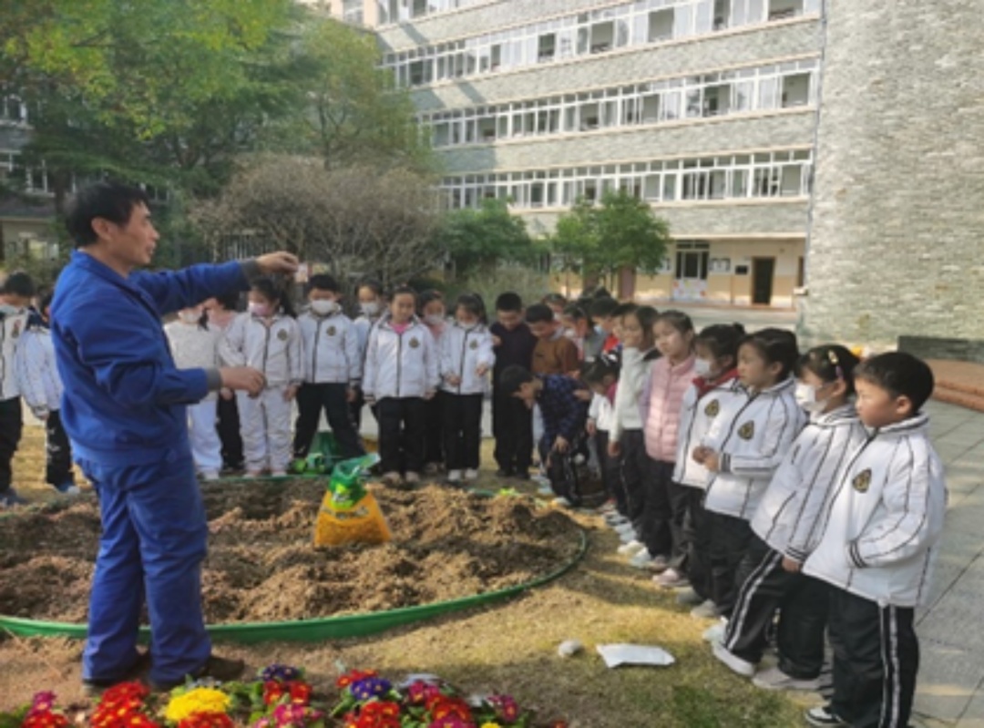 上海外国语大学附属民办外国语小学的同学们在种植蔬菜绿苗的园丁邓爷爷的带领下,了解大自然的生生不息,感受春天的生机盎然,传递对花草树木的爱护和祝福。