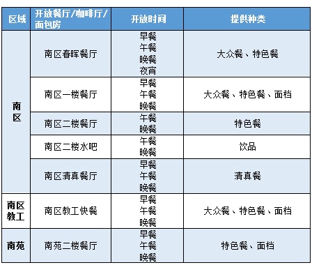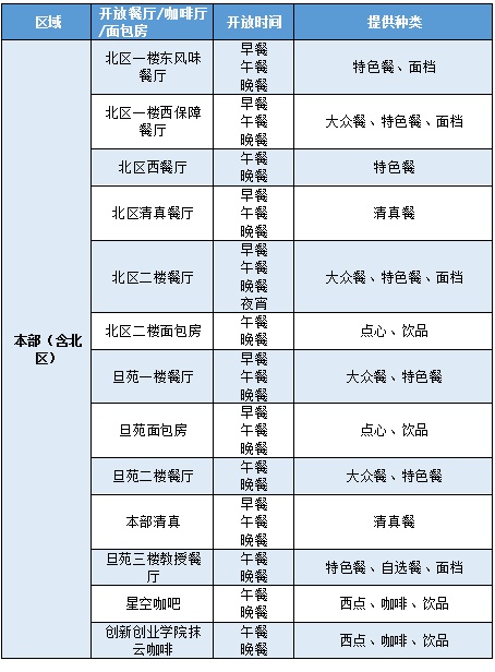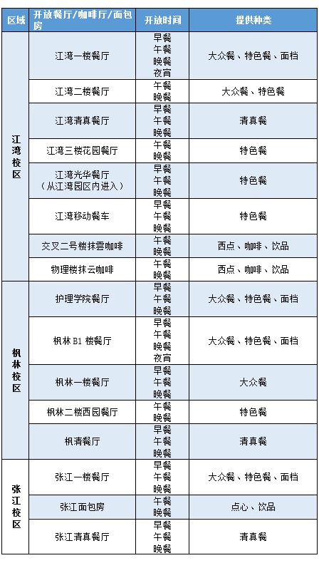 A:准封闭管理期间四校区所有食堂/面包房/咖啡暂停堂食,但会提供打包外带服务。请大家购餐时全程佩戴口罩,做好一米间隔。各校区食堂营业时间为: