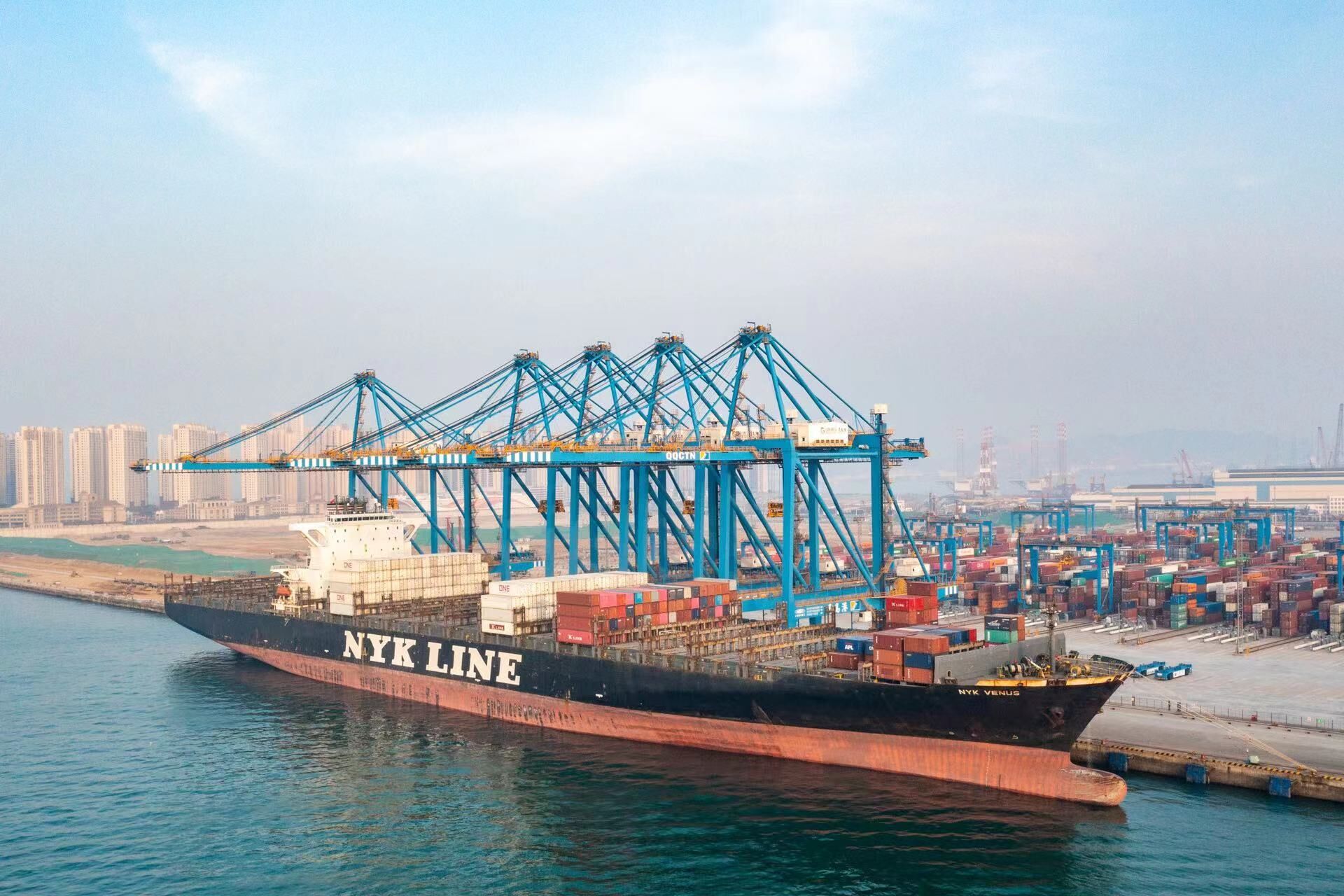 52.7自然箱/小时!3月12日,在“日邮维纳斯”轮作业中,山东港口青岛港自动化码头桥吊单机作业效率第8次刷新装卸效率世界纪录。