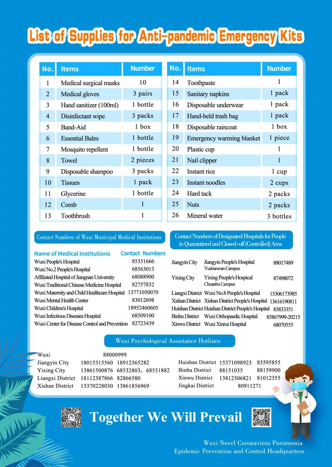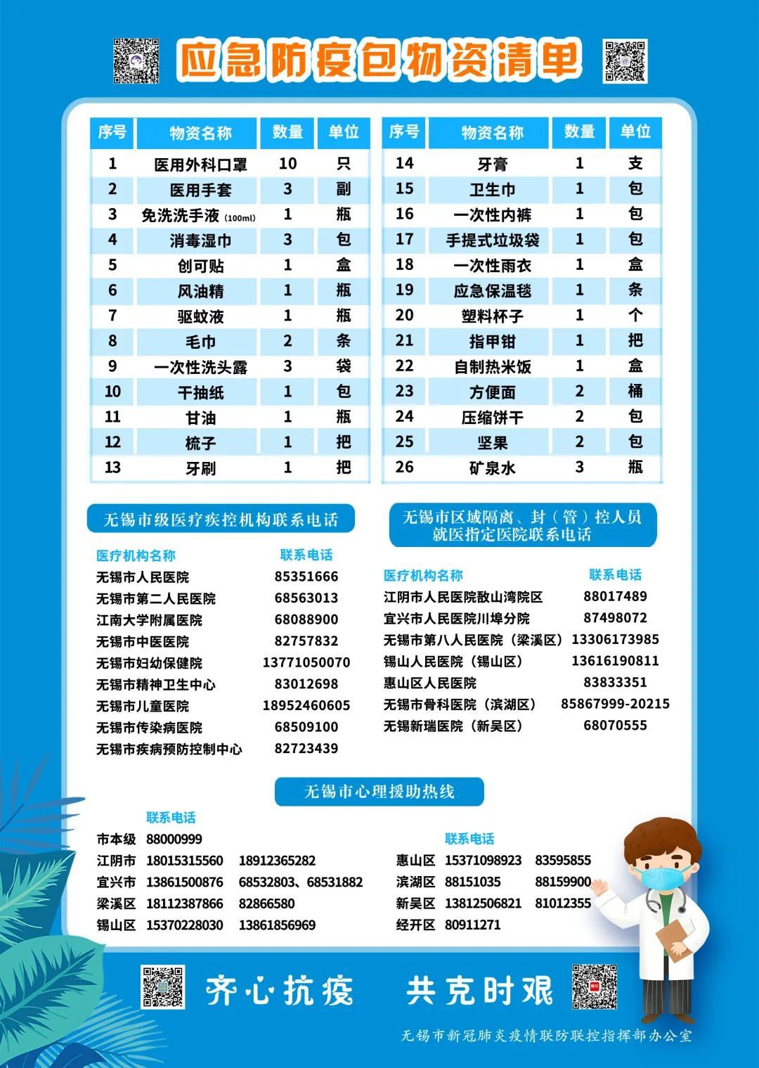 此外,清单上还印有我市医疗疾控机构、区域隔离和封(管)控人员就医指定医院电话和市心理援助热线电话,以及相关媒体新媒体二维码,方便有需要的居民及时咨询、了解外界资讯。