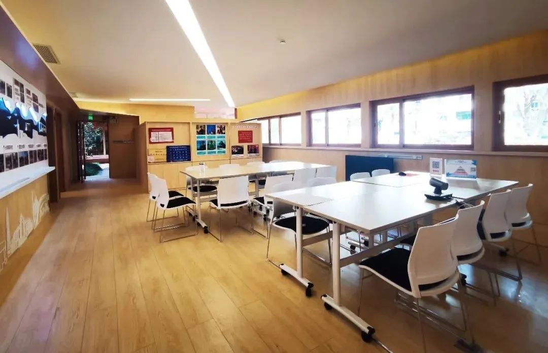 综合服务区通过桌椅、便民柜的不同组合形式,能够满足居民议事、小组学习、会议接待等不同用途。空间一侧为面向大草坪的玻璃窗,另一侧为华院小区的历史风貌墙,可以向来访者讲述“华院故事”。