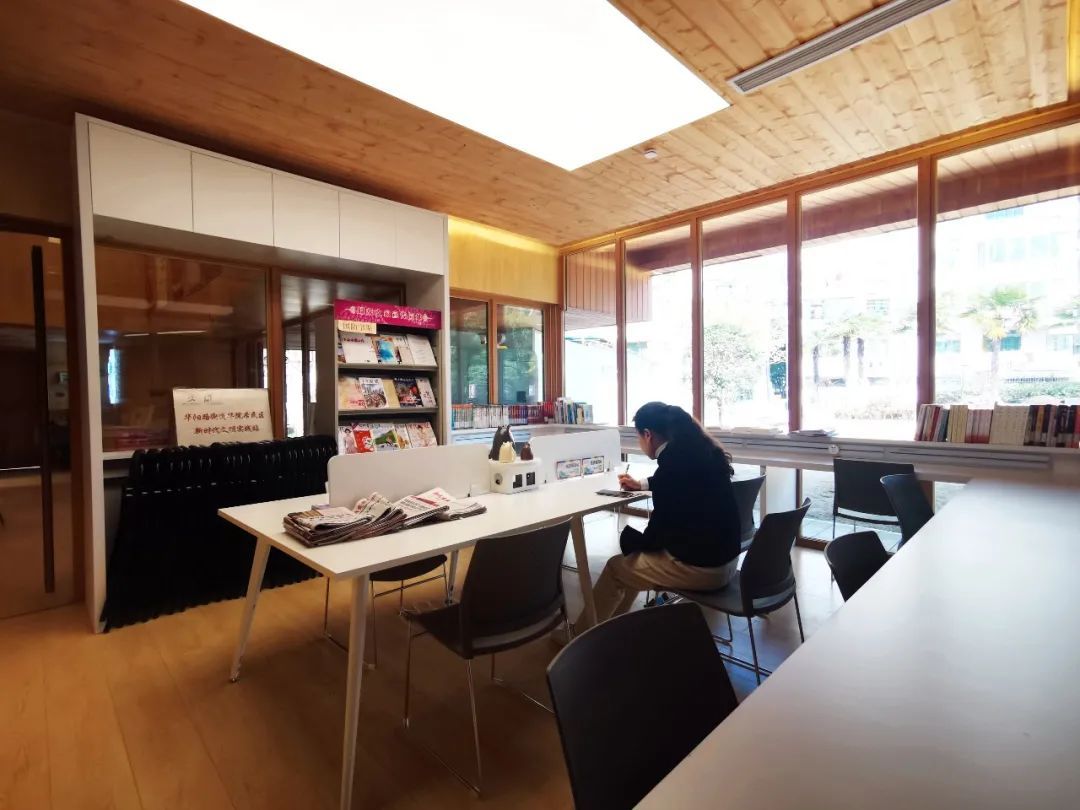 华院居民区老干部多、老教师多,居民文化素养普遍较高,多年来已经形成了每天到活动室读书看报、交流的习惯。“小木屋”里采光最好的一间小屋就用来做公共阅览区,这里宽敞明亮,大大的落地窗,映射出窗外绿地景色,环境舒适宜人。此外,公共阅览区还添置了智能图书柜、电脑等,吸引更多年轻人到此处学习。