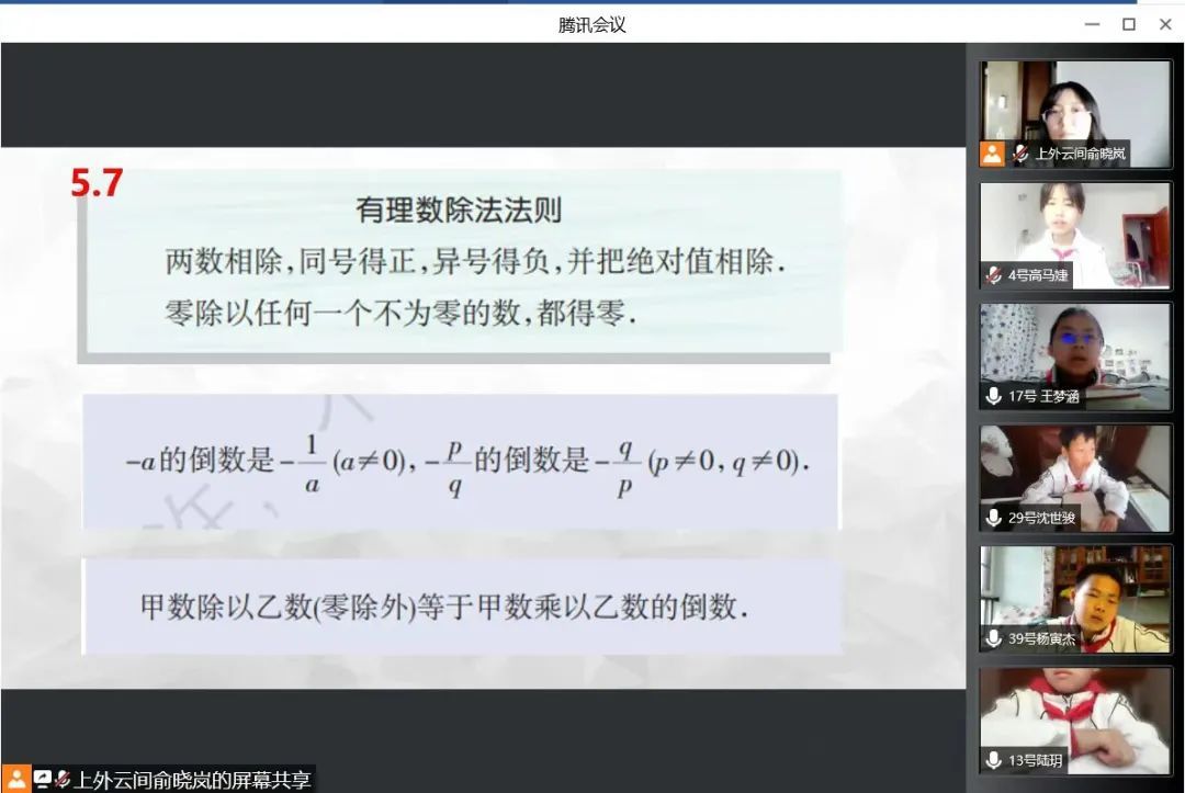 “两数相除,同号得正,异号得负,并把绝对值相除,零除以任何一个不为零的数,都得零……”清晨,上外云间中学的老师俞晓岚和预初三班42名学生相约“腾讯会议”直播间,学生们还是像在学校一样,整整齐齐地身穿校服、佩戴红领巾,用琅琅读书声开启线上学习第一天。