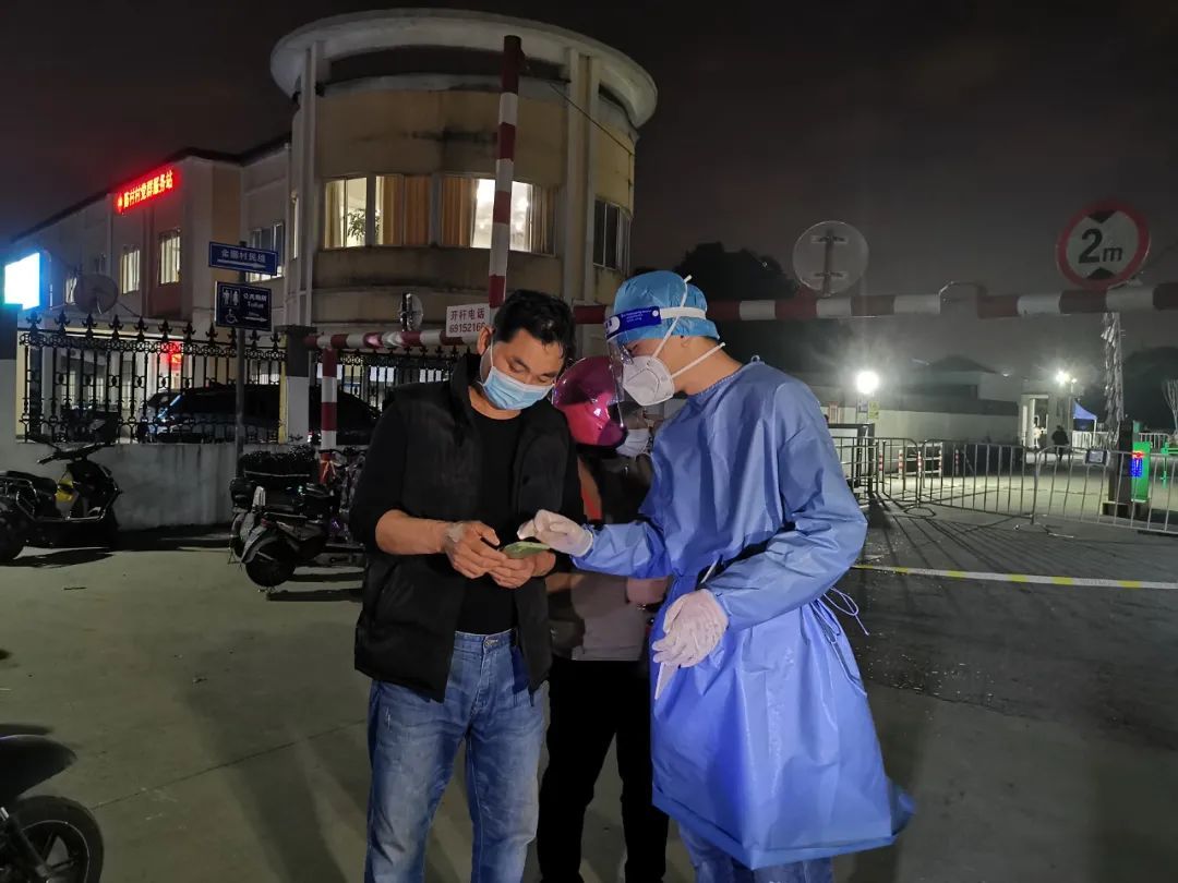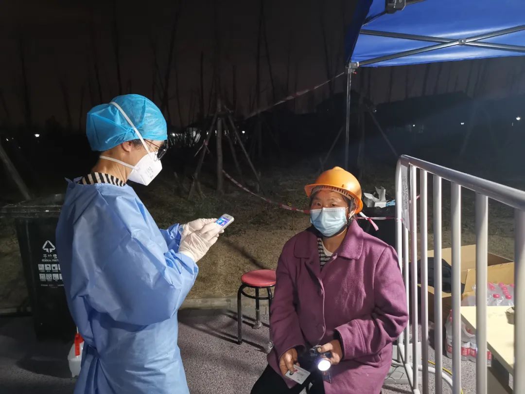 晚上8点的马陆镇包桥村核酸检测点灯火通明,村卫生干部赵燕身着蓝色防护服,正耐心地用自己的手机,给70岁的吴阿姨录入核酸检测信息。