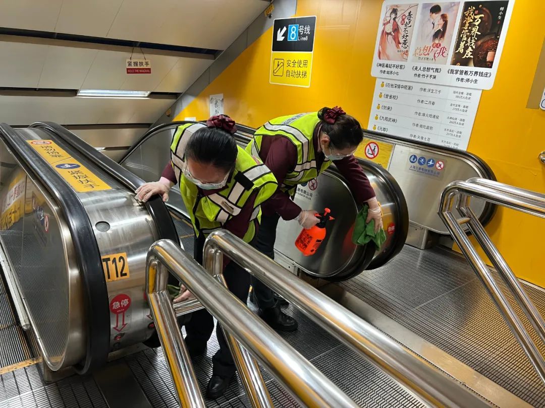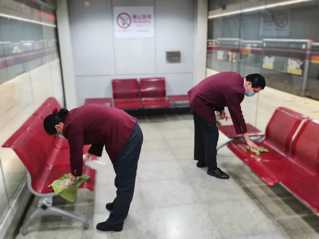 3月14日上午,上海地铁12号线南京西路站保洁员正在对车站内栏杆、扶手、乘客座椅、电梯桥箱、票务设施、自助设施、客服中心、乘客休息室、商铺等重点部位进行卫生消毒。