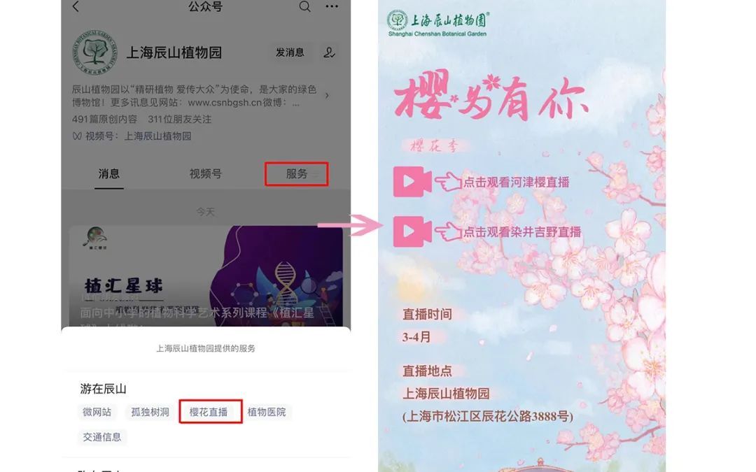 因疫情减少出门以及居家防疫的市民游客可通过辰山植物园微信公众号“游在辰山”栏目下“樱花直播”中点击观看,收获春日小确幸。