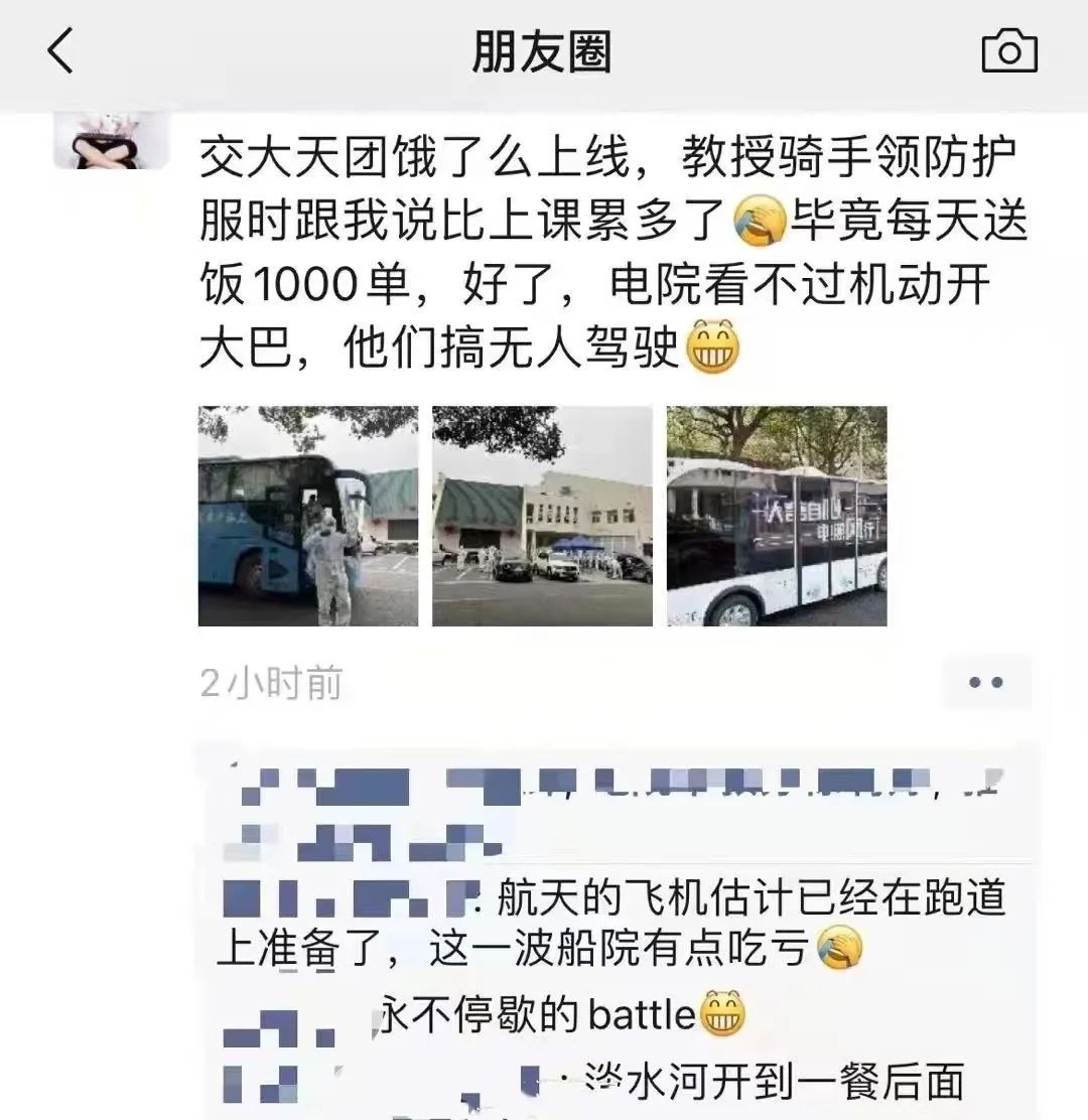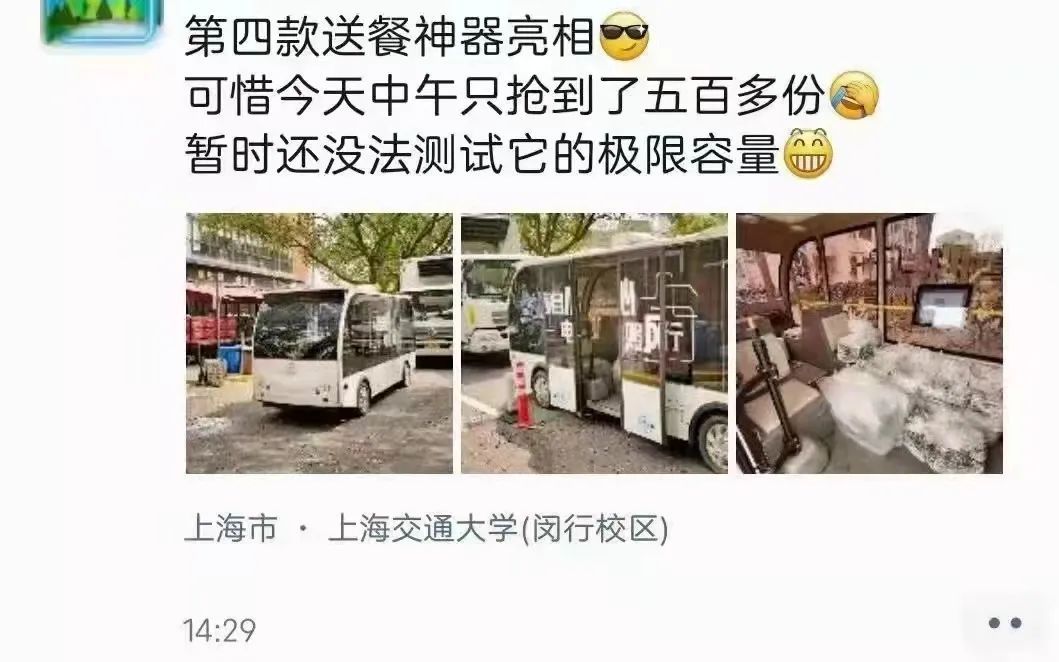 如何才能更高效将饭菜送到学生的手中?这些出身工科的“外卖小哥”还开始讨论开发算法提升送餐效率,机动学院、电院都为送饭,“卷”了起来,连船舶海洋学院、生命医学技术学院……也要一起“卷”起来了。当这些老师们“卷”起来,连无人驾驶新送饭神器都只抢到了500份饭。