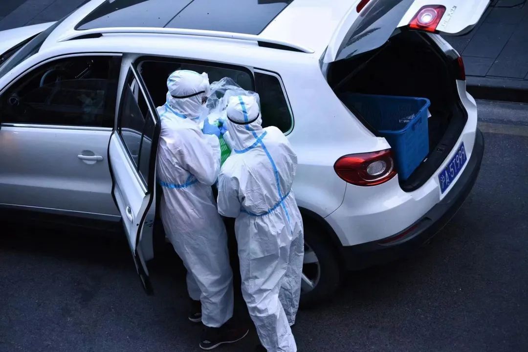将饭菜和防疫物资送到每栋楼里。