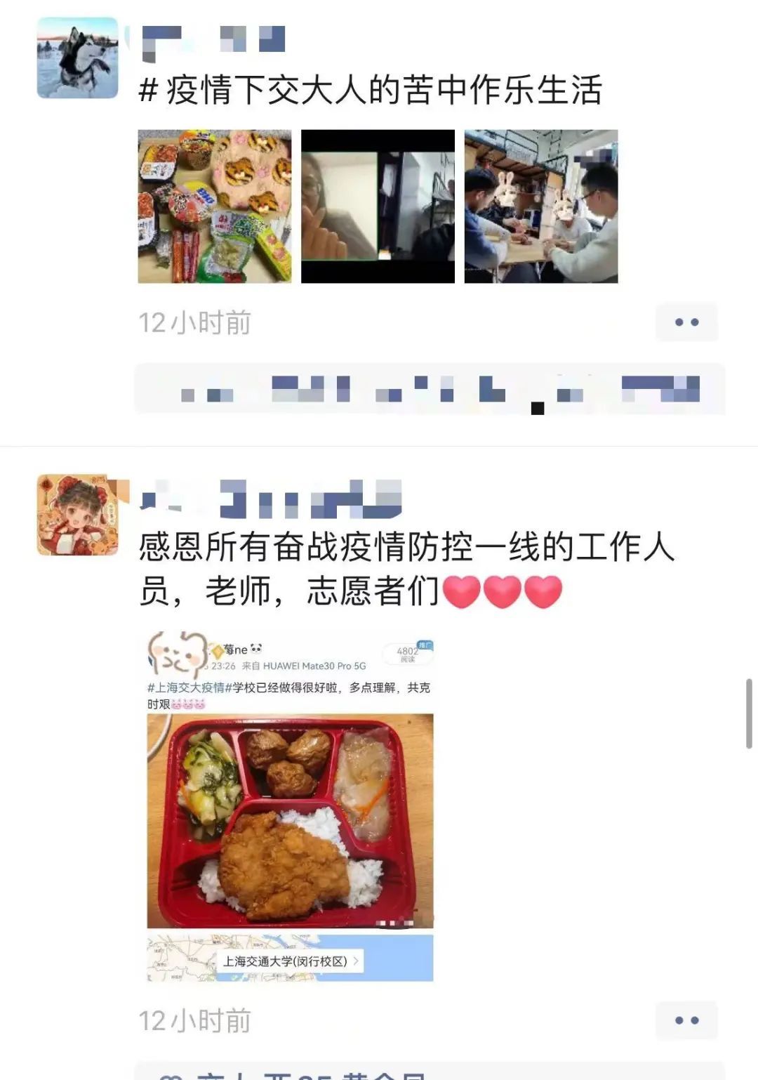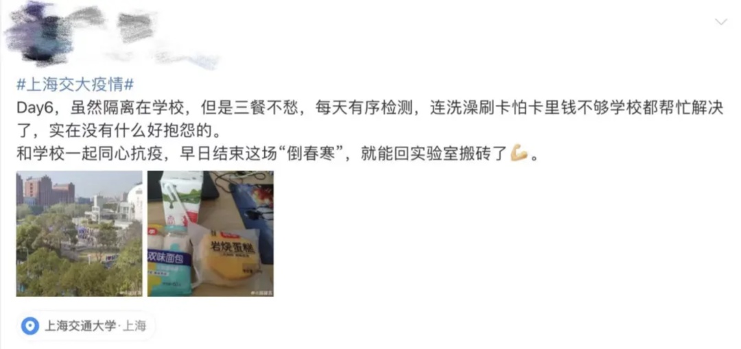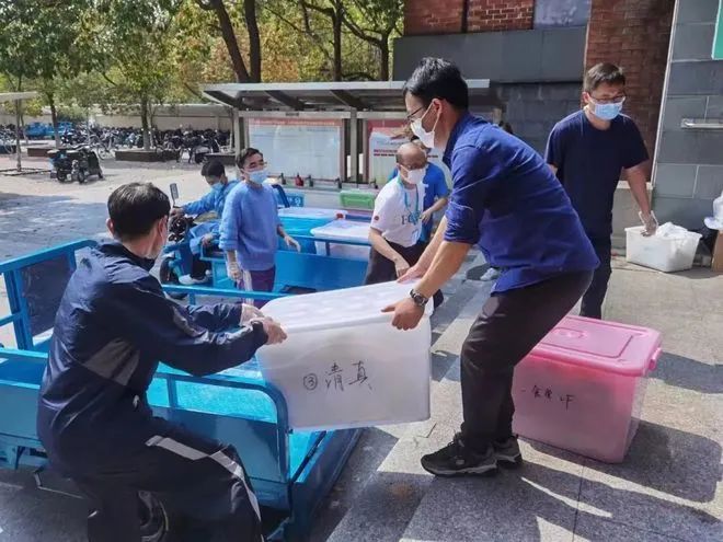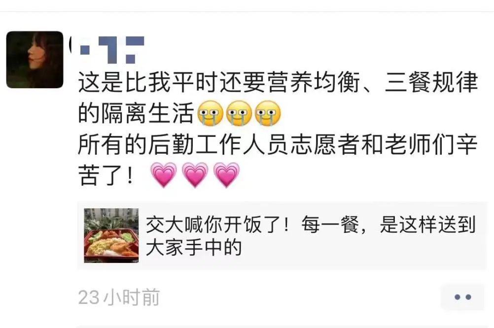 上海交通大学因疫情封闭管理后,上千名老师每天在食堂打包好饭以后,开私家车将饭菜送到每一栋学生宿舍楼下。每一栋宿舍有一名同学负责接纳,然后送到每一层楼。最后由专人送到每一个宿舍门口。