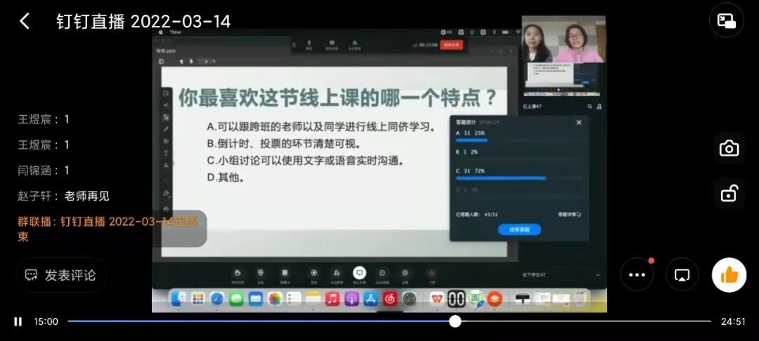 线上课堂里,袁宁和丁昊琰师徒二人组分工配合。袁老师主讲,丁老师技术支持,师徒俩借助宝山教育数字基座教育“未来宝”的线上课堂功能,实施了屏幕共享、互动留言、小组群聊和投票统计等信息化技术,学生积极参与,实现实时共创的课堂。