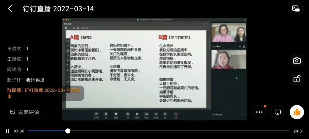 “我们都知道,课堂是需要互动的,需要交流和反馈。”如果说两年前的网课中,主要是学生观看空中课堂,那么今天,很多线上教学的课堂上已经增加了互动和交流的功能。比如教育学会宝山实验学校这节六年级的诗歌课,老师和学生时时互动,同学们还能进行分组讨论。